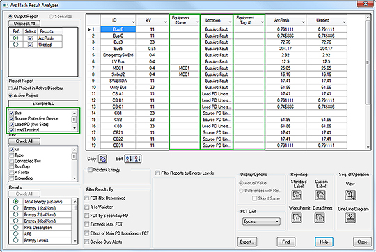 El Analizador Resultados de Arco Eléctrico es una herramienta de software que ahorra tiempo ya que compara y muestra diversos reportes de análisis de Arco Eléctrico procedentes de diferentes escenarios en una sola pantalla. El Analizador Resultados de Arco Eléctrico también puede comparar los resultados de cálculo de arco eléctrico de diferentes proyectos dentro de la misma carpeta de archivos.
