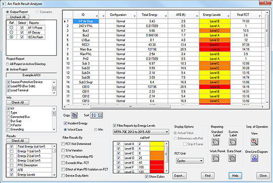 La herramienta Analizador Resultados de Arco eléctrico se incluye con el software de evaluación de riesgo de arco. Compara los resultados de la evaluación del riesgo de arco eléctrico como información general respecto al proyecto o información más específica, como los resultados de barras, dispositivos de protección o terminales de carga en un estudio de arco.
