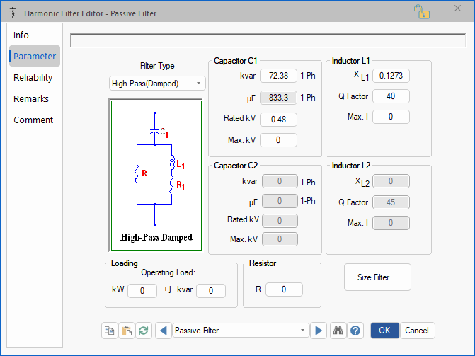 A properly designed harmonic filter can prevent the harmonic current from injecting into the system, or it can provide a low impedance path at the tuned frequency to remove a parallel resonance. The Harmonic Filter editor provides all the practical and popular filter structures for you to choose from.